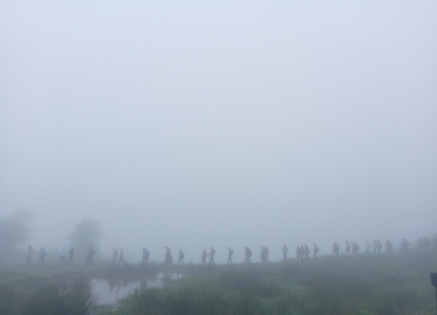 Que se passe-t-il quand le paysage visuel n'est plus qu'écoute des pas dans l'herbe à peine humide et que l'homme multitude se fait discret, hoplite du silence dans le Marais?
