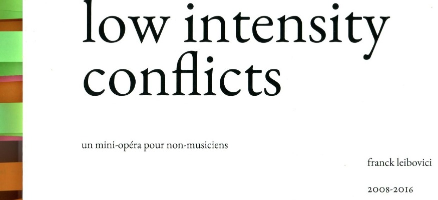 low intensity conflicts – un mini-opéra pour non-musiciens (2008-2016) retrace 8 années durant lesquelles Franck Leibovici tenta de rendre compte des conflits dits «de basse intensité», au moyen de systèmes de notation issus de la musique expérimentale, de la danse, de la linguistique. l’ouvrage relève, à la fois, du libretto d’opéra et de l’ouvrage théorique, et mêle ainsi matériaux sources, poèmes, partitions, essais.